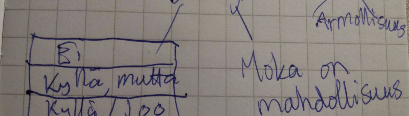 Jotenkin vuosien aikana olen oppinut sulkemaan mm. oman huumorintajuni ulos omista ominaisuuksistani. Olen pyrkinyt vakavoitumaan. Jättämään ilkikurisen huumorin ja kyseenalaistamisen vähemmälle, pyrkien olemaan vakava aikuinen, joka kuuntelee toista keskittyneesti. Sovittanut vakavan asiantuntijan naamio kasvoilleni ja huomannut etten pysty sen takaa hengittämään, eikä aitoa vuorovaikutusta pääse syntymään. Nyt vähin esin tajuan, että niin hyvä kuin tuokin maski on olla olemassa tiettyjä tilanteita varten, olen väärinkäyttänyt sitä. Jos koetan tarpeettomastai pakottaa itseni aina ja kaikissa tilanteissa siihen muottiin, jää paljon hyvää matskua käyttämättä. Jää paljon hyvää näkemättä ja kokematta.