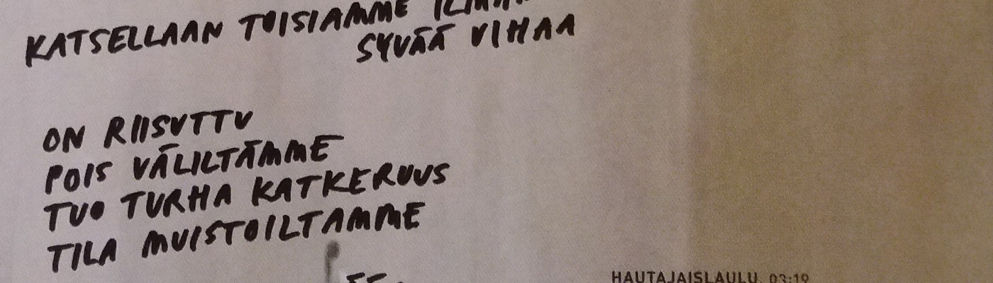 P.S. Artikkelin kuvana on Discon Hautajaislaulun sanat. Se on kaikessa yksinkertaisuudessaan kaunis kappale, joka linkittyy monella tapaa tässä tekstissä käsiteltyyn aiheeseen.