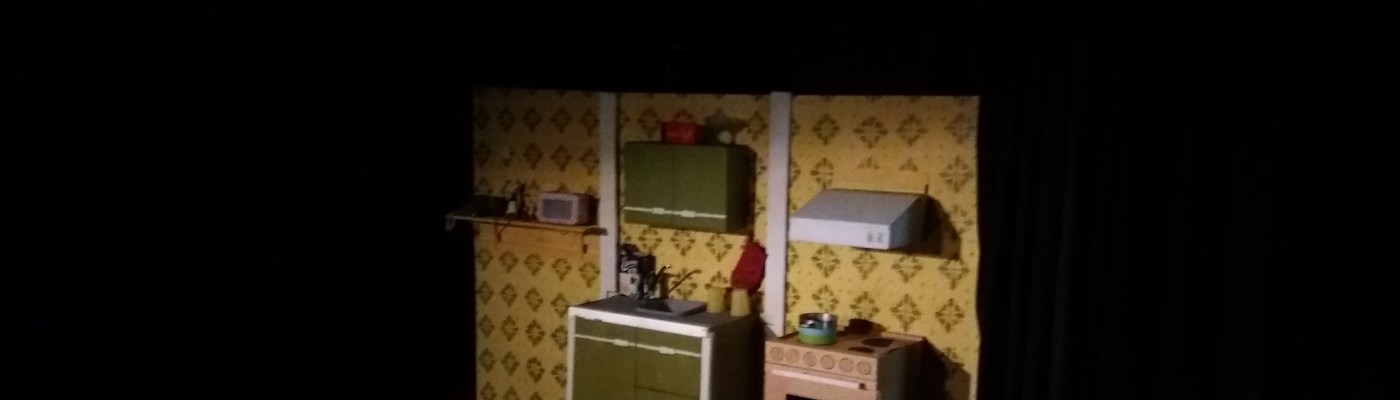 Lavastuksessa on mainiota simppeliyttä ja hienosti on mietitty monikäyttöiset kalusteet, jotka muuntuvat pienellä vaivalla kodista palvelukodin tiloiksi. Erityisen ilahduttavana pidin vanhahtavaa keittiötä, josta tuli kivalla ja lämpöisellä tavalla lapsuus ja mummola mieleen. Musiikki ja äänet ovat tärkeässä tukevassa roolissa esityksen rakentamisessa, koska puhetta ei luonnollisestikaan kokonaamioilla tehtävässä naamioteatterissa ole. Liike ja keho ylipäätään onkin tärkeä ilmaisukeino esityksessä. On ihana seurata, miten erilaisia kehonkieliä eri hahmoille on luotu. Jokaisella on oma tunnistettava tapansa liikkua ja olla. Herkullisin pieni kohtaaminen ja kehonkielellinen leikki nähdään Erkin toisen pojan ja palvelutalon hoitajan välillä. Ihanan tunnistettava ihastuksen hetki. Palvelukeskuksen mummothan ovat ihan mahtavia. Jotenkin hämmennyin siitä, kun näin lapsuuteni noita-akkahahmon lavalla ihan ilmielävänä. Aivan mahtava naamio ja puvustus. Muutenkin naamiothan tekevät myös paljon hahmoille ja erityisesti tykkään ilmeikkäämmistä naamioista, joita Erkki, hänen poikansa sekä palvelukeskuksen hoitajat ja naapurit käyttävät. Niissä on sellainen hieno puoli että tosi pienellä asennon muutamisella naamion ilme muuttuu. Hirveän hauskoja ovat myös vähän pelkistetymmin maalatut naamiot, joita osalla hahmoista on. Ihan huikeat ovat tosiaan palvelukeskuksen mummojen naamiot, joista on rakentunut tosi hauskat tyypit.