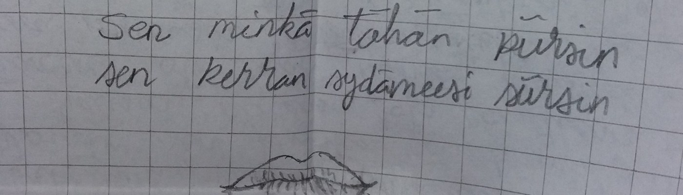 Avaan paperin ja se on nyt jo puolikas arkki, johon on kirjoitettu teksti: ”Sen minkä tähän piirsin sen kerran sydämeesi siirsin” ja sen alle on piirretty huulet.