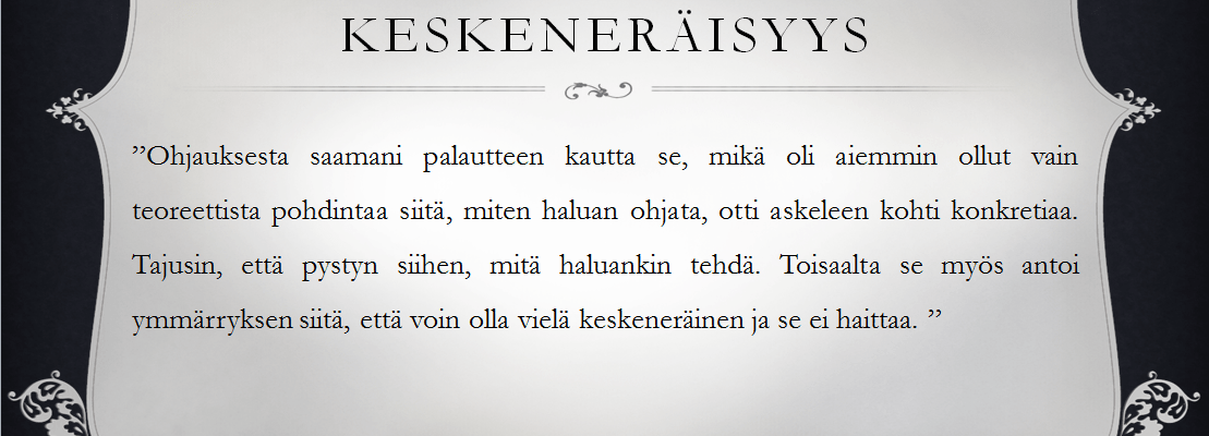 Tämä on vain yksi tapa tehdä tämä esitys ja moni muu teki sen ihan eri tavalla. Joku kertoi suorasanaisesti omaa tarinaansa, toisella oli harjoitteita sekä rekvisiittaa toteuttamastaan projektista ja kolmannella esitys, johon kuului katkelma teatteriproduktiosta, johon projektinsa toteutti. Se esitys voi olla mitä vaan, jos tekee mieli tanssia, niin tanssi. Jos tahdot puhua, niin puhu. Tyyli on vapaa ja voi valita sen, mikä itselle sopii tai kokeilla sellaista, mitä on aina halunnut kokeilla. Se on jokaisen oman opintotaipaleen päätösesitys, jonka jälkeen sitten voikin alkaa ihan uusi polku. Tässä kohtaa loppuu virallinen opinto-ohjelma ja sitten voi alkaa ohjaamaan / opettamaan tai kouluttautua lisää tai vaan ottaa muutoin tästä parista vuodesta omaan käyttöönsä kaiken sen, minkä voi ja haluaa. Kuitenkin, koska en halua jättää muille sitä ”en tiiä yhtään mitä voisin tehdä” fiilistä, mikä täydestä säännöttömyydestä seuraa, niin jaoin sen, mitä itse tein.