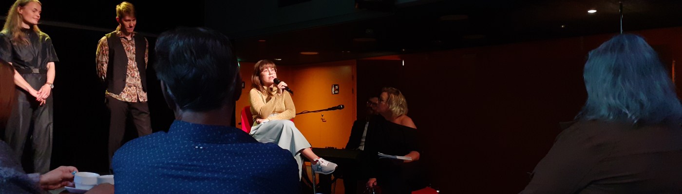 Viimeisessä osiossa Meri pääsi vielä kertomaan kirjan rakenteesta ja siitä, mitä hän näki tärkeäksi tuoda kirjaan mukaan. Tällainen asia esimerkiksi oli se, miten paljon tapahtuu ennen kuin voi mennä lavalle, valmiina astumaan sisällöllisesti tyhjän päälle. Tästä esimerkkinä Meri mainitsi genret ja sen, miten paljon niihin menee myös valmistelevaa työtä, jotta ryhmässä on ymmärrys siitä, mitkä asiat tekevät esityksestä tämän tyylilajin mukaisen. Stellahan on esimerkiksi viime vuosina tehnyt paljon mm. musikaaleja, rakkaustarinoita sekä Nordic Noir -tyylin rikostarinoita, joten niitä tyylilajeja on varmasti treeneissä harjoiteltu ja tutkittu ennen kuin niitä on lähdetty yleisölle tekemää. Improssa, vaikka tarinat ja sisällöt ovat aina yllätys, niin tehtäessä koko illan esityksiä, joilla on ennakkoon määritelty genre, esiintyjillä täytyy olla joku käsitys tyylilajin peruspiirteistä ja lainalaisuuksista. Tämä ryhmän sisäinen ja jaettu tietous tyylilajista luo raamit myös lavatekemiselle, vaikka edelleen millä tahansa tyylilajilla on mahdollista kertoa hyvin monenlaisia tarinoita. Yksinkertaisesti sanottuna: jos tehdään romanttista komediaa, niin sillä on omat perinteensä ja tunnistettavat piirteet (kliseet), jotka tekevät siitä myös katsojalle tunnistettavan. Kun ne tuntee, niin sitten sillä tyylilajilla voi leikkiä vapaammin ja myös rikkoa sen sääntöjä ja perinteitä.