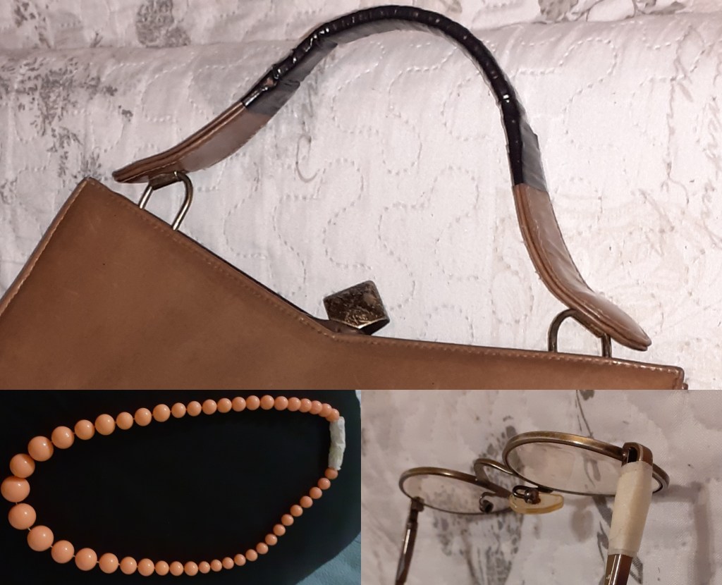 Silmälasien ohella myös käsilaukun hihna ja helmet on korjattu teipillä, joten kyllä se selkeästi on Elvin suosima korjausmetodi. Toki käsilaukussa on ihan jo kestävyyden ja ulkonäön vuoksi sähköteippiä, mutta kaikki muu on sitten korjattu sillä, mitä helpoimmin on saatavissa.